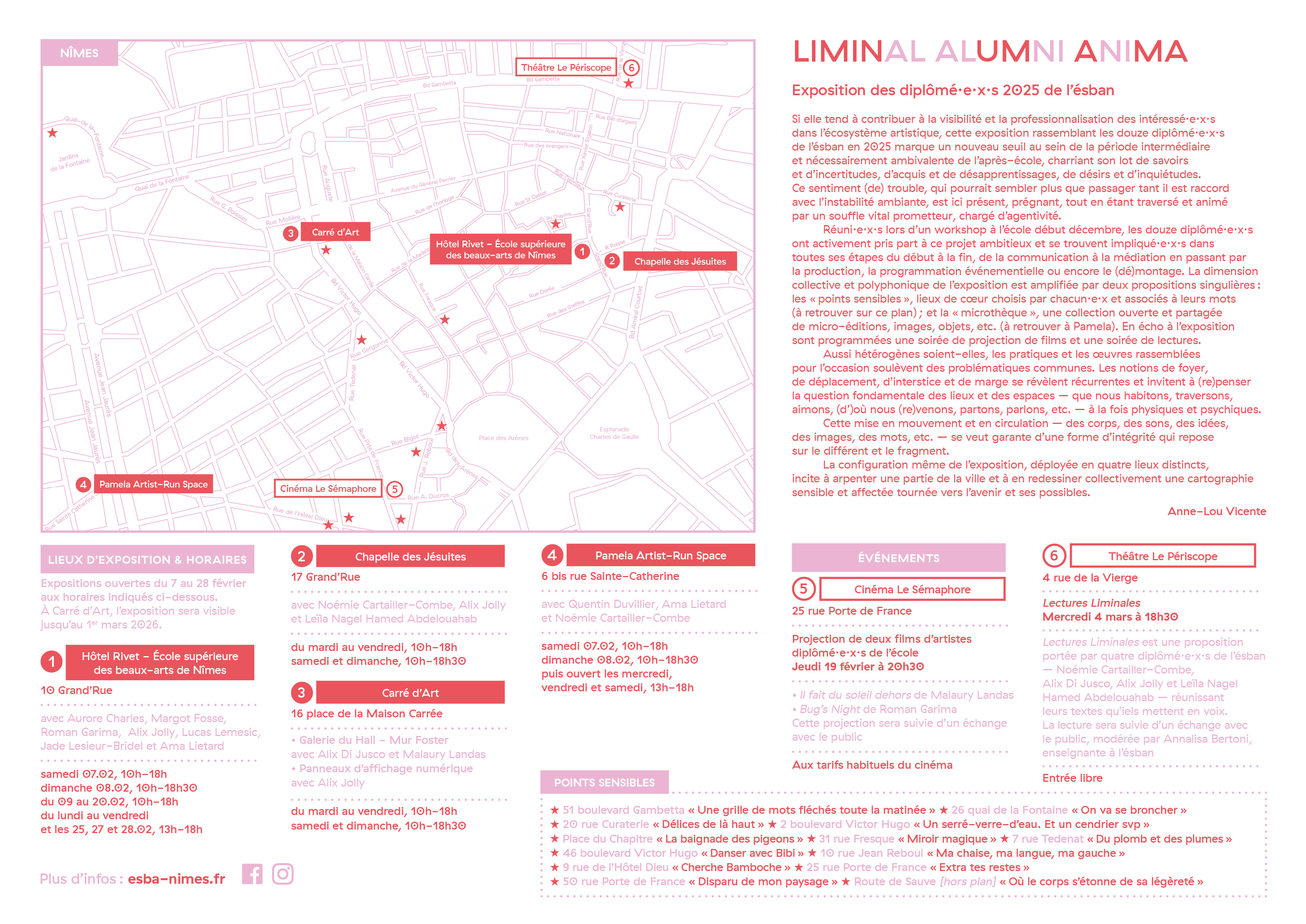 Réuni·e·s lors d’un workshop à l’école début décembre, les douze diplômé·e·x·s ont activement pris part à ce projet ambitieux et se trouvent impliqué·e·s dans toutes ses étapes du début à la fin, de la communication à la médiation en passant par la production, la programmation événementielle ou encore le (dé)montage. La dimension collective et polyphonique de l’exposition est amplifiée par deux propositions singulières : les « points sensibles », lieux de cœur choisis par chacun·e et associés à leurs mots (à retrouver sur le plan de visite) ; et la « microthèque », une collection ouverte et partagée de micro-éditions, images, objets, etc. (à retrouver à Pamela). En écho à l’exposition sont programmées une soirée de projection de films et une soirée de lectures.