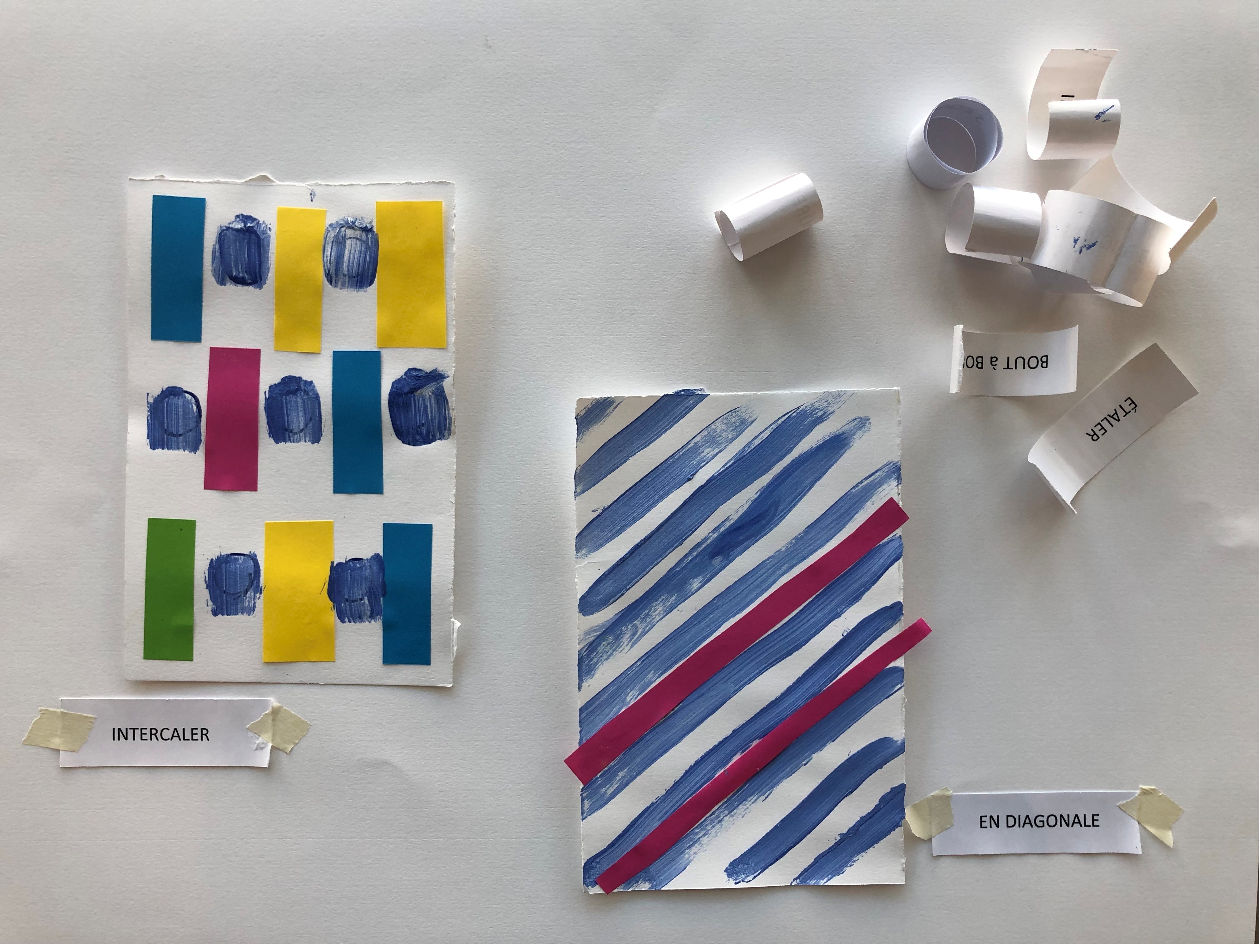 Un atelier-jeu où les enfants tirent au sort des consignes ou des mots-actions pour inventer leur propre système de peinture .